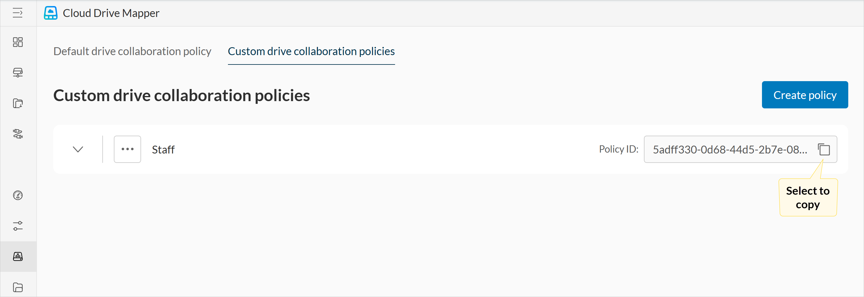 | Drive collaboration | DriveCollaborationPolicyId | Drive collaboration page > Custom drive collaboration policies tab |