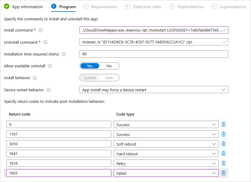 In the Program section, type the complete installation command in the Install command box: .\CloudDriveMapper.exe /exenoui /qn /norestart LICENSEKEY=your license key.